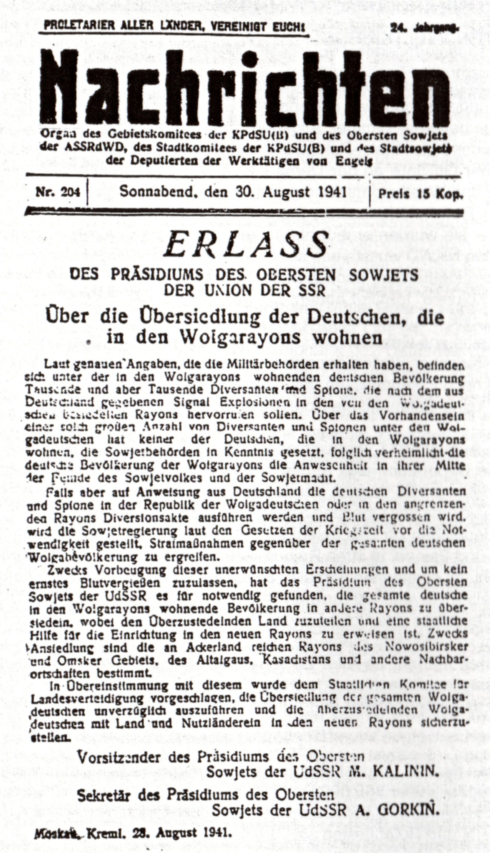 Mit dem Erlass des Präsidiums des Obersten Sowjets der UdSSR „Über die Übersiedlung der Deutschen, die in den Wolgarayons wohnen“ vom 28. August 1941 begann die Deportation der Deutschen in der Sowjetunion und somit die jahrzehntelange Verfolgung und Diskriminierung der russlanddeutschen Bevölkerungsgruppe in der UdSSR.