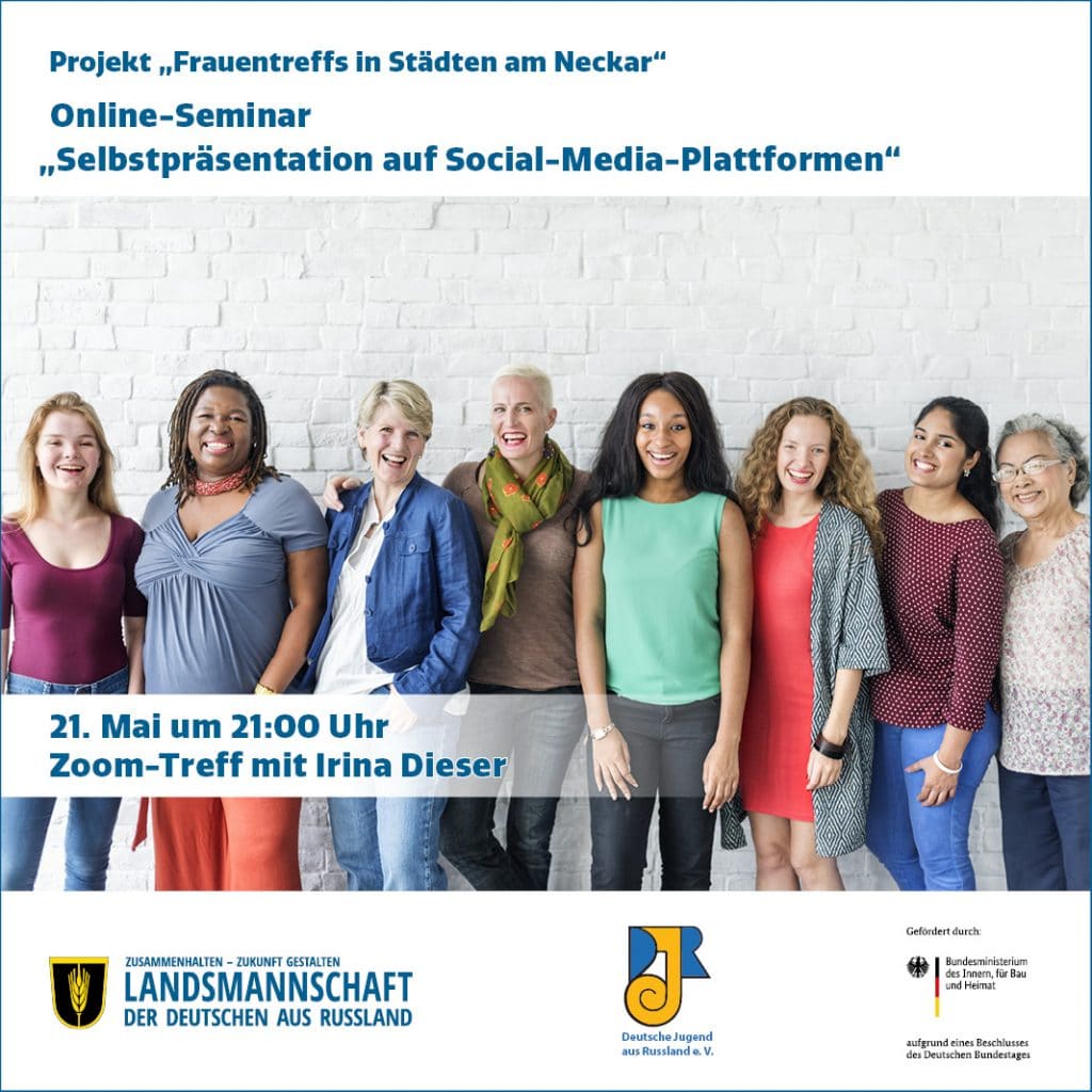 Am 21.05. um 21:00 Uhr findet unser nächstes Online-Seminar im Rahmen des Projekts „Frauentreffs in Städten am Neckar“ zum Thema „Selbstpräsentation auf den Social-Media-Plattformen“ statt.