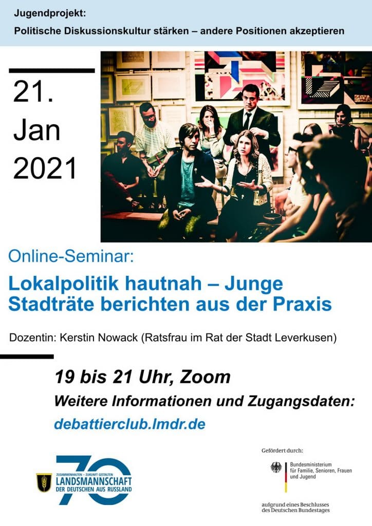 Gemeinsam mit der Leverkusener Stadträtin Kerstin Nowack besprechen wir die Möglichkeiten für Jugendliche, sich politisch einzubringen. Die digitale Veranstaltung findet im Rahmen des LmDR-Jugendprojektes „Politische Diskussionskultur stärken – andere Positionen akzeptieren“ statt und wird durch das Bundesministerium für Familie, Senioren, Frauen und Jugend (BMFSFJ) gefördert.